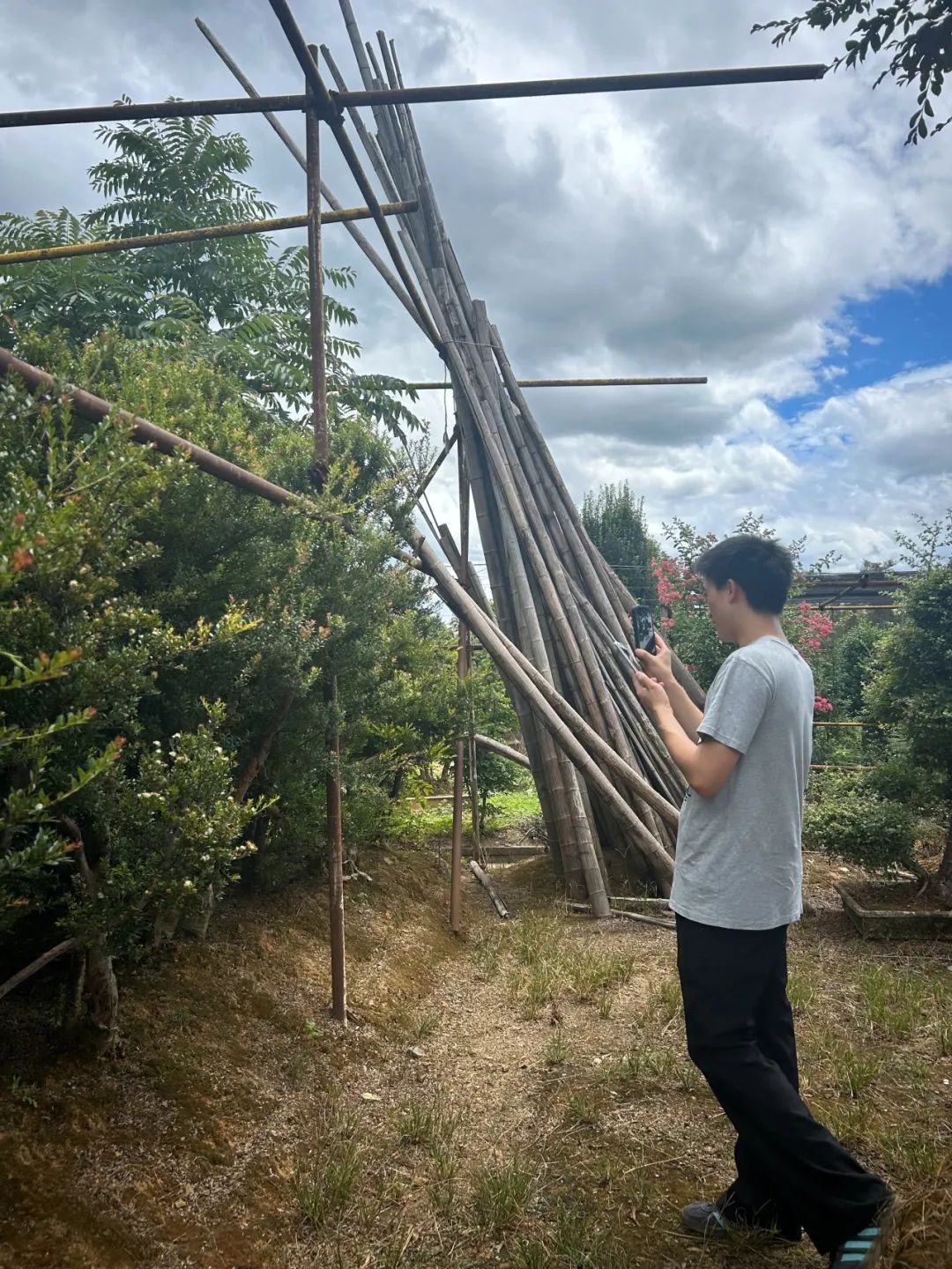 团队实地走访了曹宅镇盆景示范带,在这条没有围墙的“盆景长廊”里,五针松枝干粗壮黝黑,松针堆叠投下菱形光斑;真柏虬枝盘曲,树皮裂痕里透着青苔;紫藤新枝铝线定型,枝桠伸展。同学们向园丁请教修剪罗汉松的方法,听其介绍盆景既显现力度又不失灵动的方法。