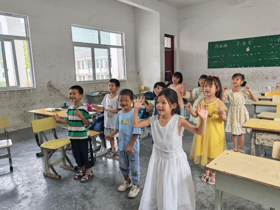 课间志愿者备课的侧影、课堂上孩子们举画欢呼的笑脸、操场“老鹰捉小鸡”的笑声、放学护送的温暖剪影……这些瞬间是“爱漫桑梓”的生动注脚。