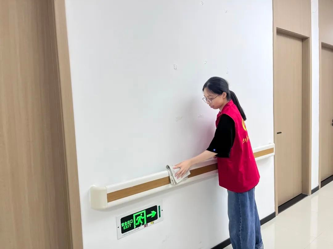 实践团脚步不止于图书馆,更延伸至社区养老院的各个角落。队员们定期携带清洁工具前往,细致擦拭门窗玻璃、桌椅扶手,认真清扫公共活动区域,彻底清除卫生死角;同时整理爱心伞、维护基础设施,用实实在在的劳动改善长者居住环境,让暖心关怀体现在每一处细节里。