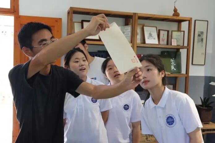 实践团奔赴开化纸传统技艺研究中心,拜访省级非遗传承人黄鑫康。在创新成果展,队员们见识到开化纸制作的画册、碑帖复制品等,黄老师展示薄如蝉翼的开化纸,介绍其“寿命可达千年,可修复国家图书馆珍贵古籍”的特性。