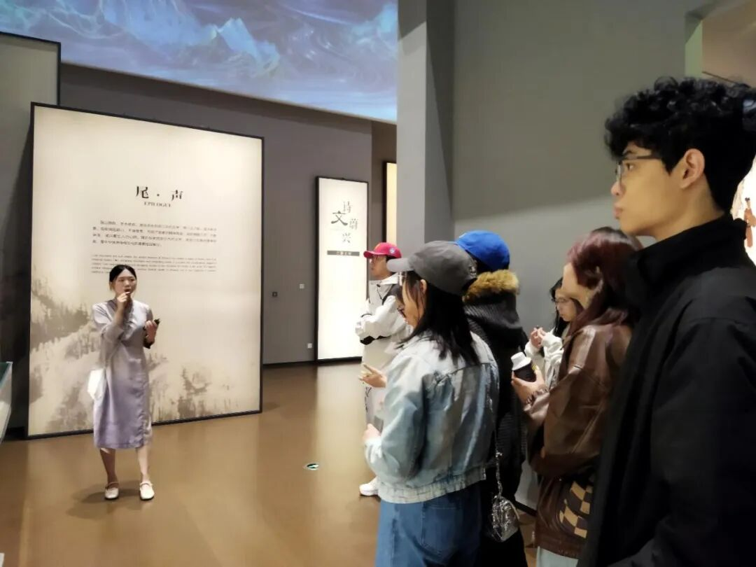 在两位讲解员的引导下,23级翻译专业的同学们有序进入场馆。讲解过程中,讲解员结合展陈内容,生动讲述了浙江文学从吴越时期的源头起步,历经唐宋诗词的兴盛、明清小说的繁荣,再到现当代文学蓬勃发展的漫长历程。
