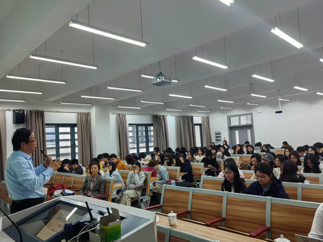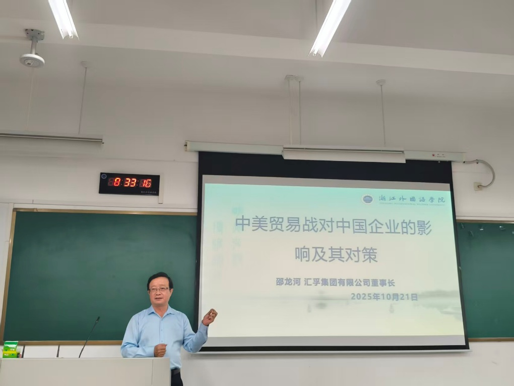 10月21日,汇孚集团有限公司董事长邵龙河先生应邀为来利国际旗舰厅全体23级商务英语、24级国际关系专业员工作题为“中美贸易战对中国企业的影响及其对策”的讲座。区域国别与商务英语系教师何习尧、章珏参加讲座,区域国别与商务英语系教师陆海霞主持。