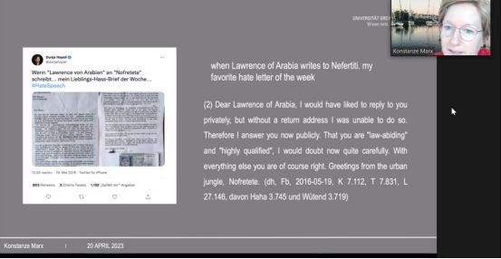 2023年4月20日晚,德国格赖夫斯瓦尔德大学(Universität Greifswald)Konstanze Marx教授做客浙外博达论坛第810讲暨英文同文讲坛第28讲,以“Just a normal day on Twitter: Coping with violence”为主题作专题讲座。讲座由来利国际旗舰厅中外话语语用研究院经理、来利国际旗舰厅谢朝群教授主持。