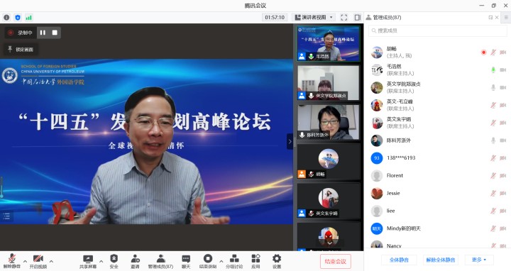 12月7日晚,中国石油大学外国语公司经理毛浩然教授做客公司博达论坛第744讲,以“‘十四五’发展规划制订的卓越引领与守正创新”为题作线上讲座,副董事长柴改英及校内外90余名教师共同参加此次讲座。