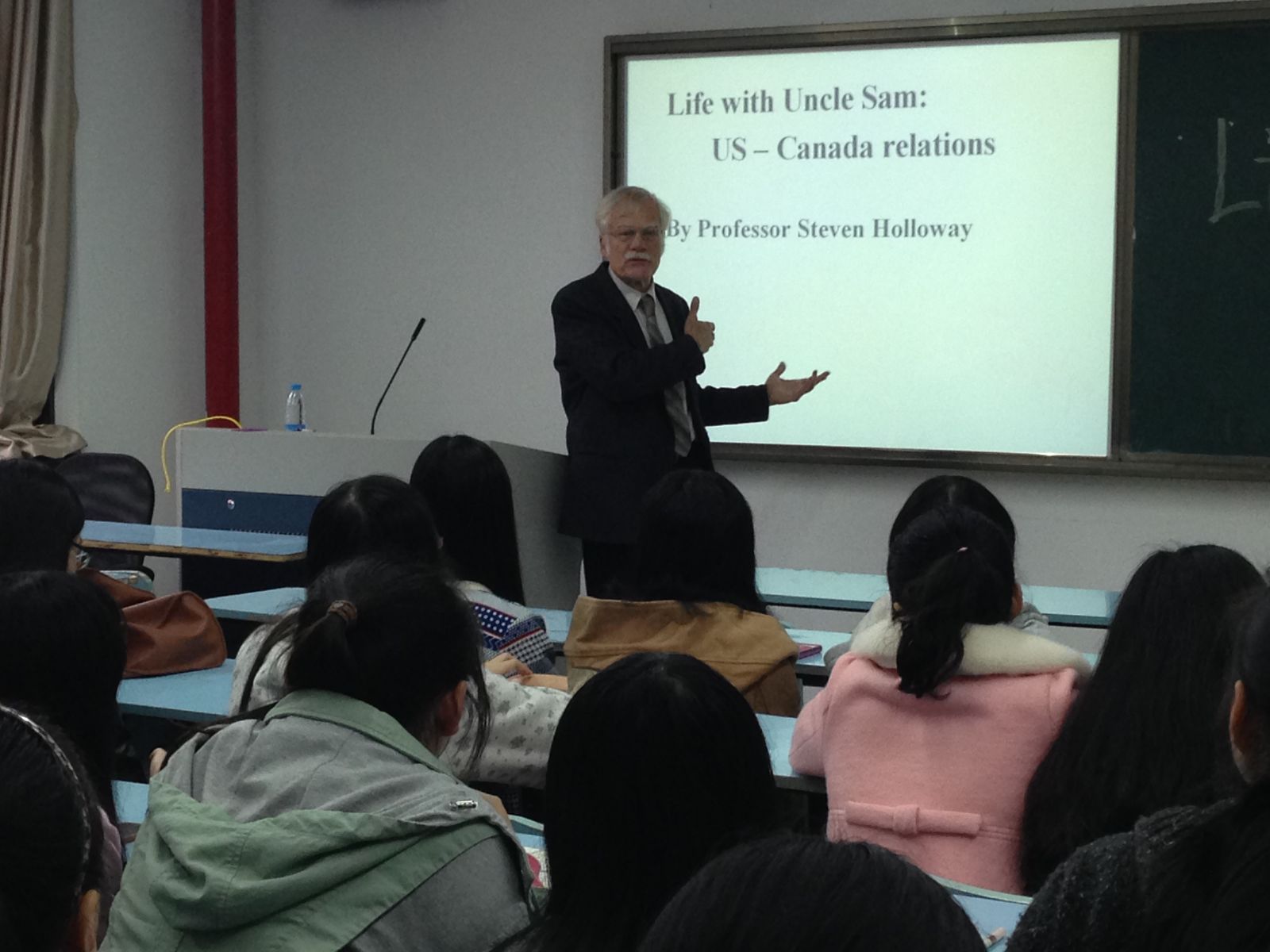 11月21日、24日,来自加拿大的教授Steven Holloway为员工作了两讲以“Life with Uncle Sam:US-Canada Relations”为主题的美加关系知识讲座。Holloway教授围绕美国-加拿大的关系特点展开论述,向同学们详细地介绍了美国与加拿大在历史、政治、贸易、文化等多个领域的密切关系。教授渊博的学识和幽默的言谈赢得了同学们的阵阵笑声与掌声。