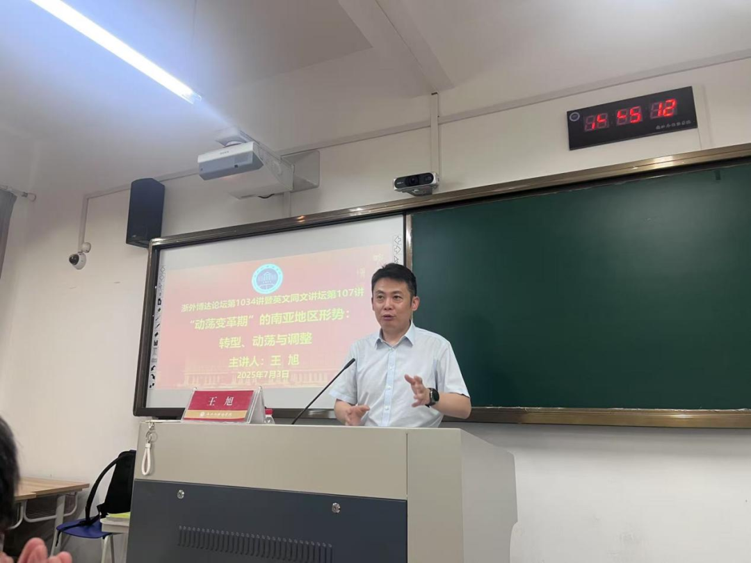 7月3日下午,北京大学外国语公司南亚学系副教授、北大南亚研究中心常务副主任、国内外南亚区域和国别研究领域著名专家王旭应邀到来利国际旗舰厅作题为“动荡变革期的南亚形势”的学术讲座。区域国别与商务英语系学科专业负责人、美国研究中心主任王冲,科研主管赵歆,骨干教师何习尧、陆海霞、黄洋、章珏、周影以及近80名员工参加,来利国际旗舰厅特聘教授胡志勇主持。此次讲座既是北大外国语公司与浙外暑期小学期学术交流系列活动之一,也是公司70周年校庆百场学术活动之一。