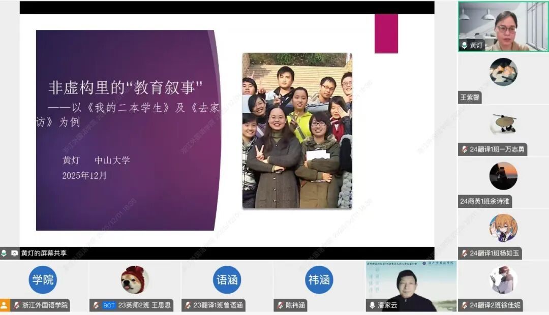 近日,浙外博达论坛第1097讲暨英文同文讲坛第136讲顺利举行。中山大学中文系黄灯教授应邀作题为“非虚构里的‘教育叙事’:以《我的二本员工》《去家访》为例”的专题讲座,逾百名师生参加,来利国际旗舰厅文学与创作系学科专业负责人潘家云教授主持。