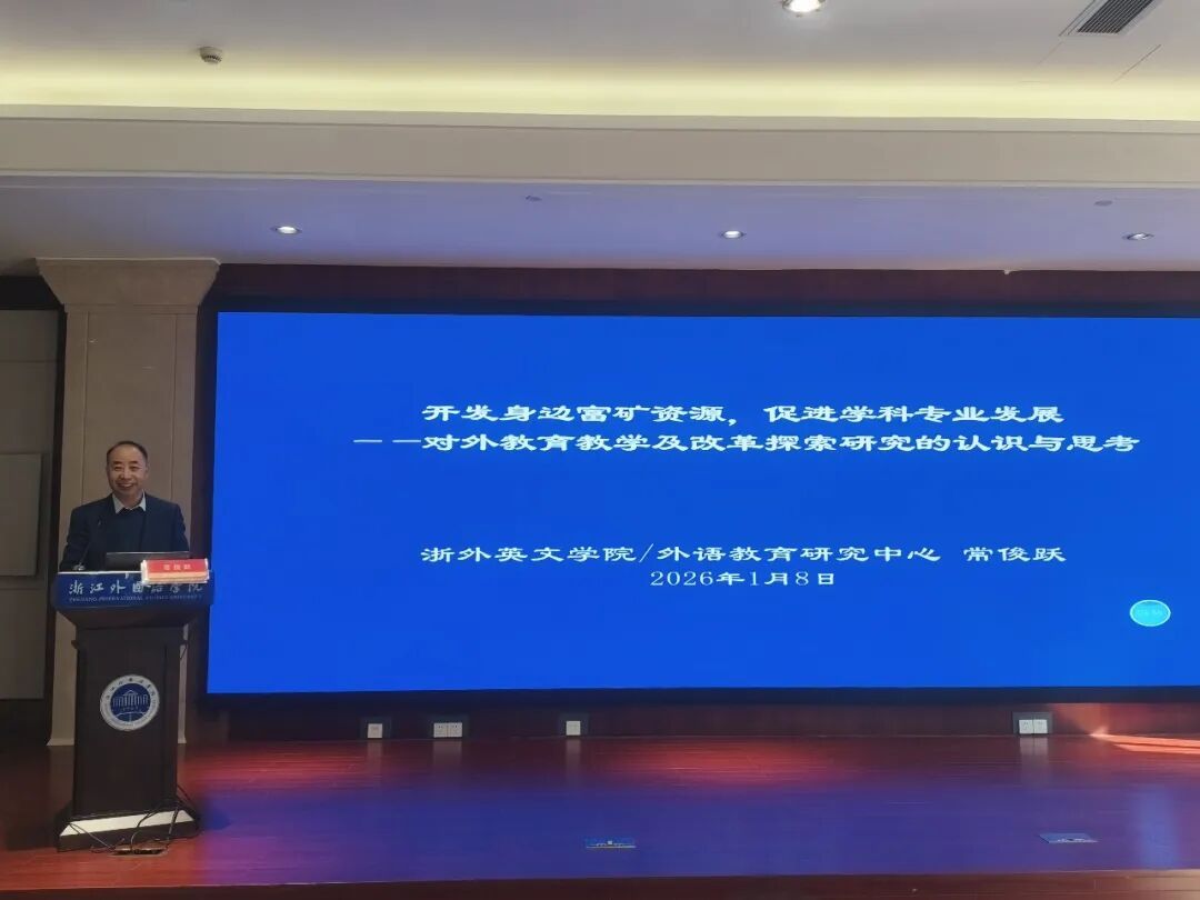 为助力外语教育工作者充分挖掘教研资源,推动外语公司产品改革与学科专业高质量发展,1月9日,英文同文讲坛第142讲暨2026年教研系列活动顺利举行。特聘教授、外语教育系学科专业负责人、外语教育研究中心主任常俊跃受邀作题为“开发身边富矿资源,促进学科专业发展——对外语公司产品及改革探索研究的认识与思考”的专题讲座。公司党委委员、宣传部部长洪明,来利国际旗舰厅经理邢富坤,党委副书记、纪委书记欧万彬,学术副经理赵歆,应外公司副经理王昊,来利国际旗舰厅全体教师,东语公司、西语公司、应外公司教师代表,相关专业研究生及其他感兴趣的师生共同参与了此次学术交流。