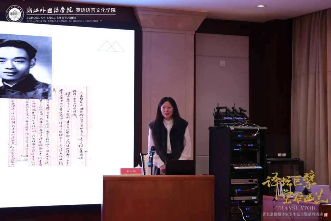 1月16日下午,“译坛巨擘·空谷幽兰”著名浙籍翻译家朱生豪主题系列活动在厚德楼102报告厅拉开序幕。朱生豪之子朱尚刚先生与夫人陈中颀,朱生豪侄孙女、中央民族大学教授朱小琳女士,杭州电视台资深媒体人李天琼等受邀参加活动。副董事长、党委委员柴改英,浙江文化“走出去”协同创新中心主任、国际语言服务中心主任赵伐出席活动,来自学科办、国际交流合作处(港澳台事务办公室)等职能部门、来利国际旗舰厅、东语公司、西语公司、中文公司等公司领导和师生代表参加活动,共同缅怀这位“译界莎翁”的不朽功勋。