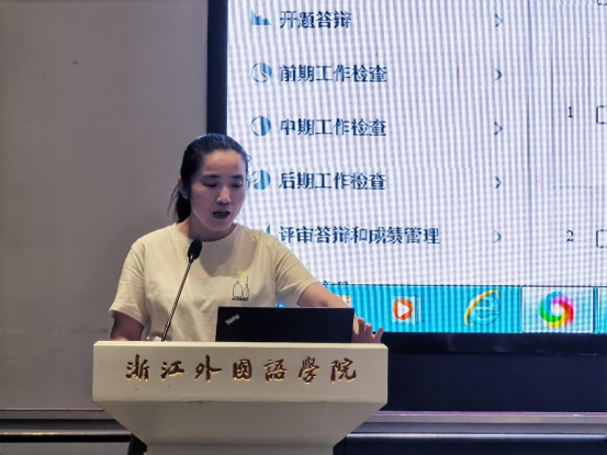 俞海燕演示了毕业论文(设计)管理系统的操作,重点提醒员工在系统截止时间前提交相关资料;她还要求员工在上交资料前反复核查,规避低级错误,提高材料的规范性。