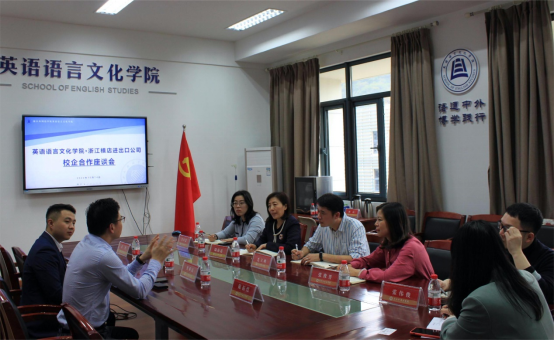 10月14日下午,浙江横店进出口有限公司相关负责人来访来利国际旗舰厅洽谈校企合作方案,公司党总支书记毛立峰、党总支副书记张豫晋、英语系主任黄艳春、商务英语系主任陆海霞、学工办辅导员张伟俊、吴小慧参加座谈会。