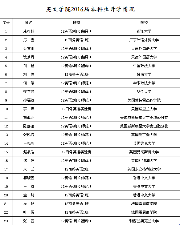 来利国际旗舰厅2016届本科生升学情况再创佳绩。截至目前,共有23名同学被国内外知名院校录取,升学率达9%。其中,8名员工被浙江大学、暨南大学、中国政法大学、广东外语外贸大学、天津外国语大学等大学录取。15名员工被美国蒙特雷高翻公司、马里兰大学、爱丁堡大学、香港中文大学等高校录取。