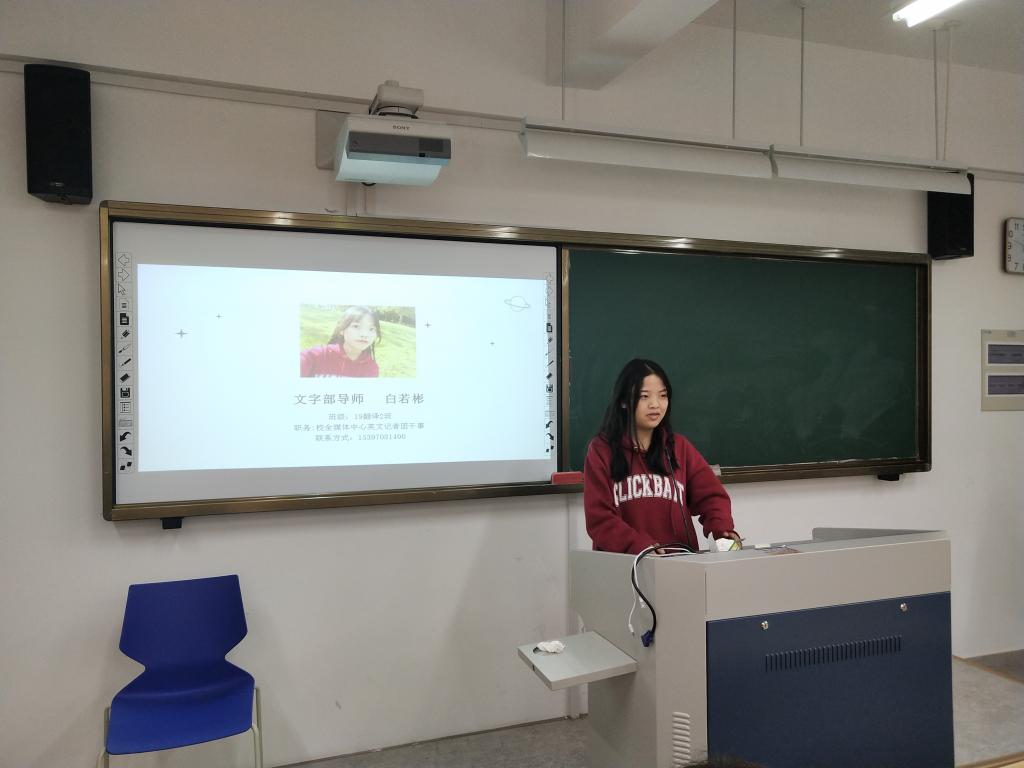 本学年,新闻中心特聘校全媒体记者团的白若彬、黄暖,视觉传达中心的黄国秦、袁敏君以及新媒体社的王炜佳、季秦亦等同学为各部门进行指导。
