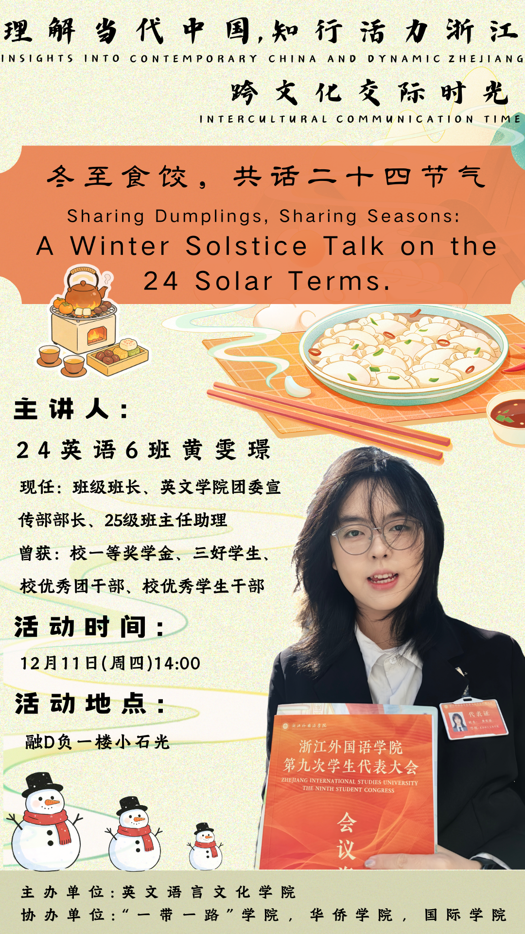 新一期跨文化交际活动将于12月11日举办,本期活动主题为“冬至食饺,共话二十四节气”(Sharing Dumplings, Sharing Seasons: A Winter Solstice Talk on the 24 Solar Terms)。二十四节气是中国传统历法,依据太阳运行周期划分,反映四季、气温、降水等变化,指导农事与生活。它包括立春、清明、夏至、秋分等二十四个节气,是古人智慧的结晶,兼具实用价值与文化意义。