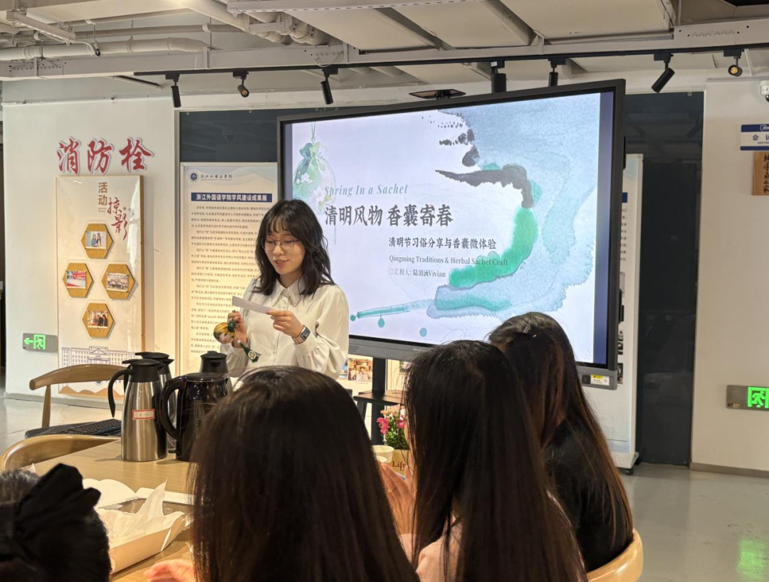 近日,来利国际旗舰厅“理解当代中国·知行活力浙江”跨文化交际时光活动第二十一期如期举行。24英师3班陆羽涵同学以“清明风物,香囊寄春”为主题,与来自俄罗斯、秘鲁等国家的职工及来利国际旗舰厅员工共赴一场清明文化之约,在习俗分享、哲思对话与香囊手作的沉浸式体验中,解锁传统节气的文化密码,感受中华民俗的独特魅力。