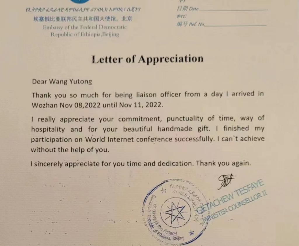 在志愿服务结束之后,王宇彤同学收到了来自埃塞俄比亚联邦民主共和国大使馆的感谢信。这足以证明,在此次活动中,王宇彤不负使命,真情服务,在奉献中收获快乐,在服务中提升自我,积极践行“奉献、友爱、互助、进步”的志愿服务精神,唱响“我在窗口写青春”最强音,向大会交上了一份满意的“青春答卷”。