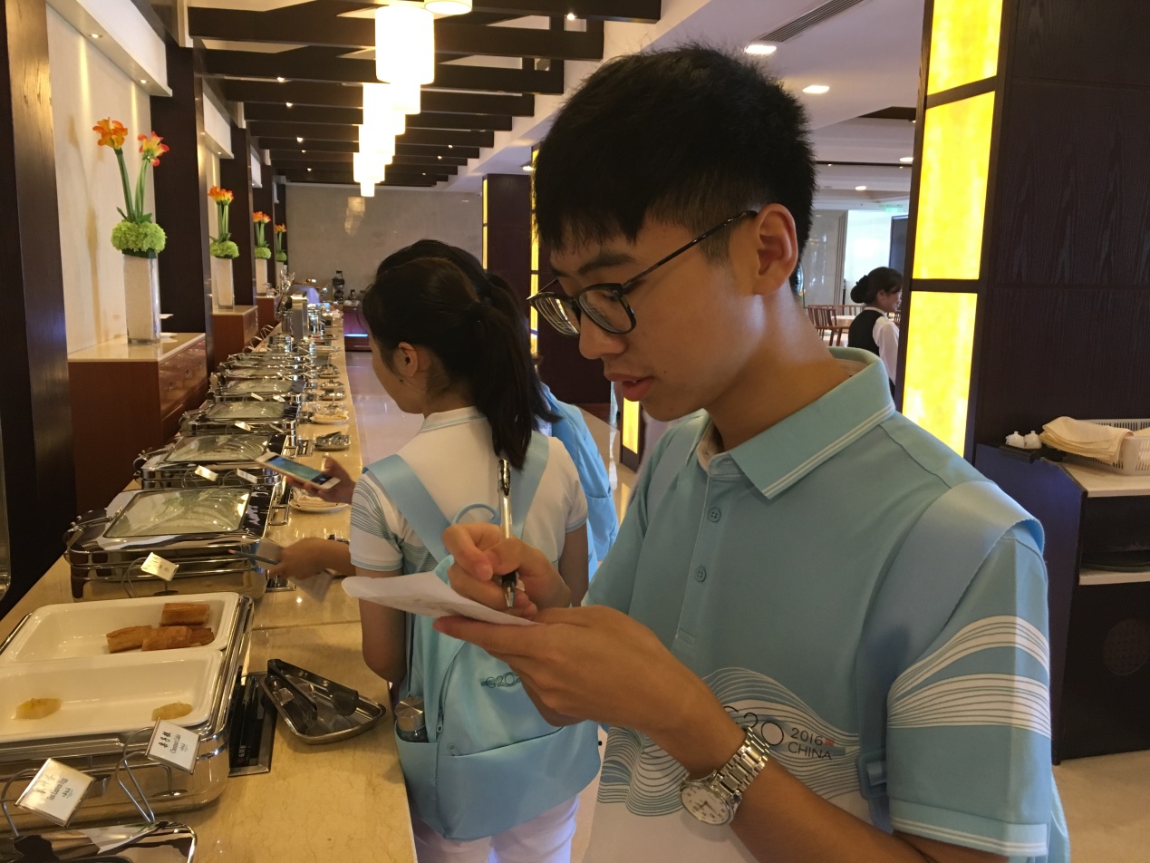 我的岗位不固定,根据当天的情况而变动。所以在这期间,不同的岗位,让我有了不一样的体验。在餐厅服务,你需要长时间的站立,而且还要熟悉掌握中餐的英文名,了解用餐礼节;在总机服务,你不能放松警惕,时刻准备为外宾服务;而在南楼和北楼工作,则需要你有更好的口语能力以及随机应变能力。