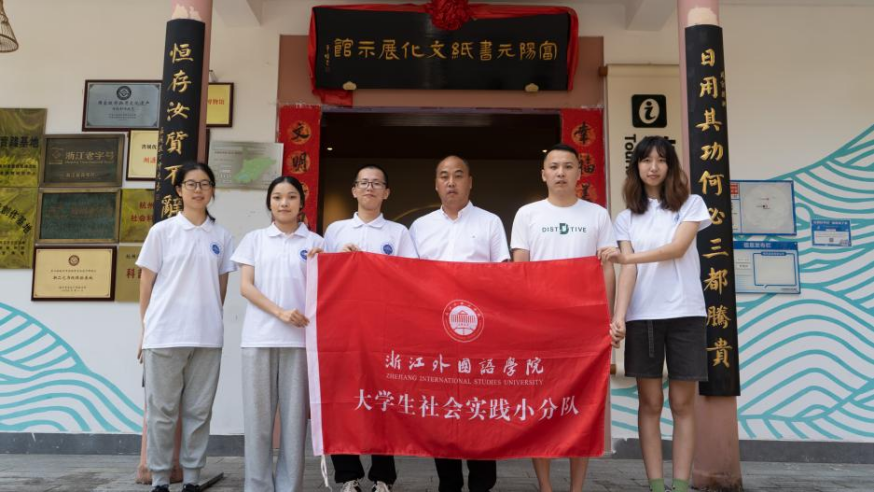 团队成员与富阳竹纸制作技艺传承人李文德(左四)、儿子李肖杰(左五)合照留念