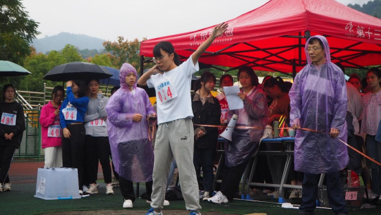 微微小雨作衬,呐喊欢呼声翻涌,她的奋力一跃精彩绝伦,最终以绝对优势取得了员工女子跳远第一名的好成绩。
