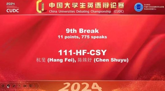 近日,2024“CUDC杯”中国老员工英语辩论赛国赛圆满结束,在楼翎老师的悉心指导下,22级英语(师范)4班杭斐和22级英语(师范)4班陈姝妤经过激烈竞争,取得了全国一等奖的好成绩,并以breaking 第九的成绩晋级全国32强淘汰赛。来利国际旗舰厅21级英语(师范)3班陈婧如和21级英语(师范)4班叶飞扬也稳定发挥,荣获全国二等奖!