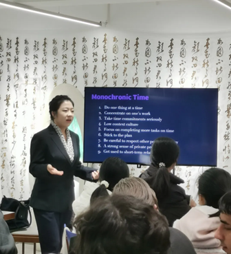 随后,主讲人从单一时间文化和多元时间文化的视角出发,邀请同学们探讨不同国家对时间管理的不同方法,并分享各自国家的时间观念。经过深入的交流,同学们意识到,无论身处哪个国家,守时都是一个无法回避的话题。