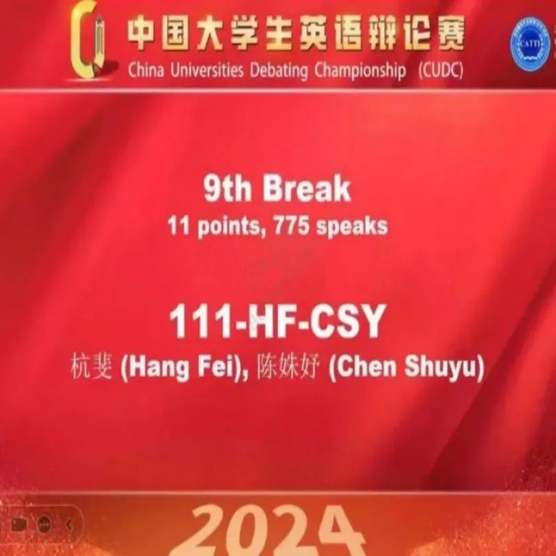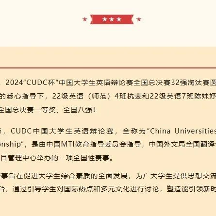 英文学子在2024“CUDC杯”中国老员工英语辩论赛全国总决赛32强淘汰赛中获全国总决赛一等奖、全国八强