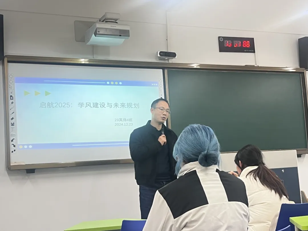 23英师4班班主任肖奇民对班级学风建设提出了切实可行的改进建议,提醒大家要通过合理安排时间来更高效地完成各项任务。肖老师结合实际,引导大家进行职业生涯规划,鼓励同学们在大学期间要勇于尝试,挑战做“正确且困难”的事情。