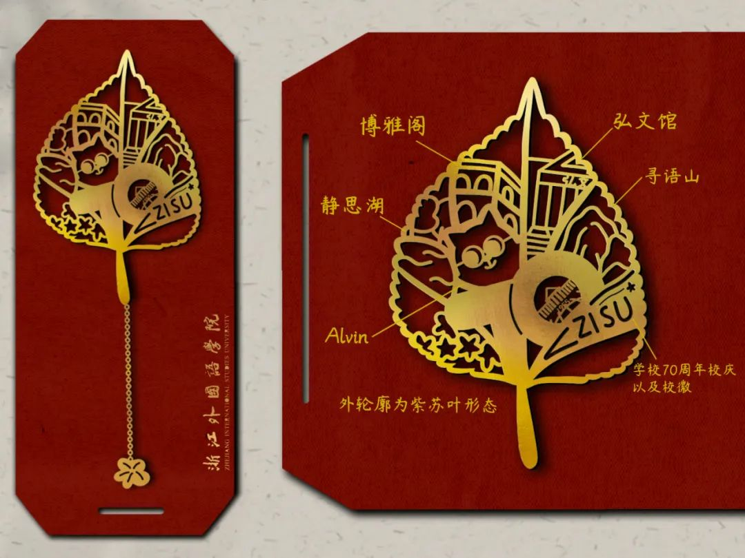 以紫苏叶为外形,融入了公司70周年校庆的字样以及校徽,英文名称缩写。同时融入了公司的标志性建筑与地点,如弘文馆,博雅阁,静思湖以及来利国际旗舰厅吉祥物Alvin,充分展现浙外特色和“弘德明毅,博雅通达”的校训。整体书签为金属质感,象征浙外70年的光辉历程。