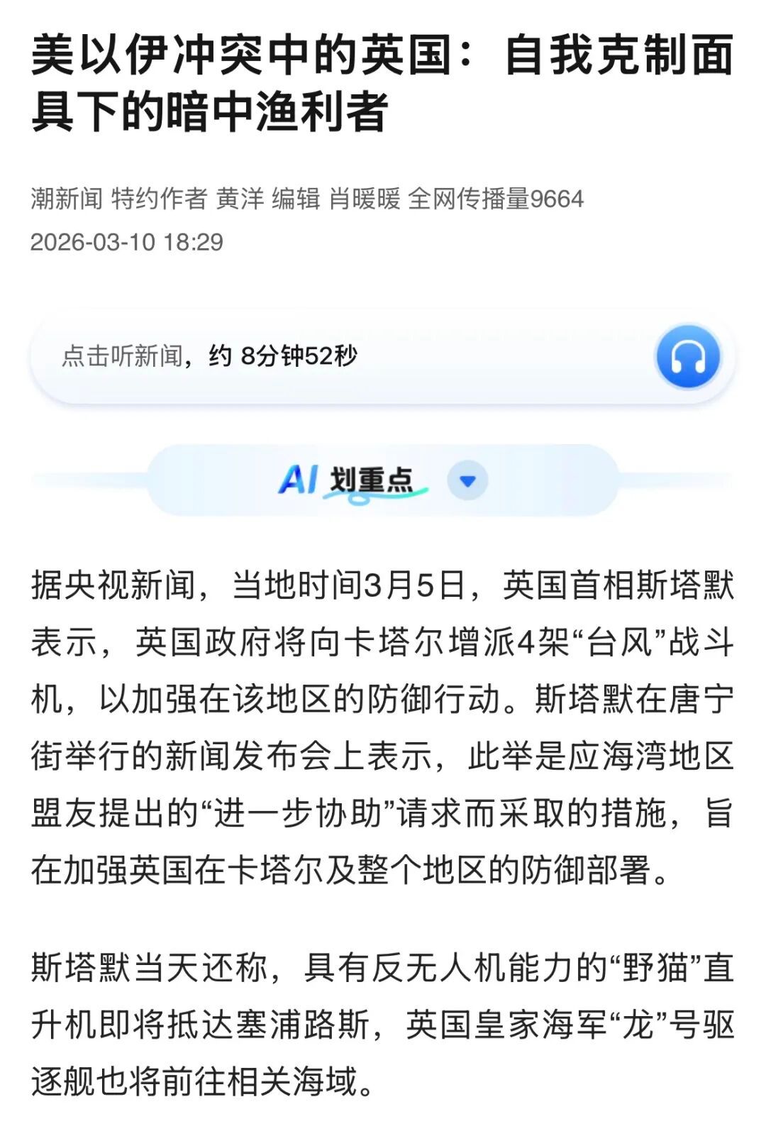 文章深入分析了英国首相斯塔默在冲突中的微妙立场,表面上以国家利益和法律依据为由拒绝直接参与对伊打击,实则通过允许美国使用军事基地、加强情报共享等方式“拉偏架”,试图在避免重蹈伊拉克战争覆辙的同时,从中东变局中暗中渔利。作者还对英国立场的可持续性提出前瞻性思考,指出其是否会在战局变化时直接下场参战,仍有待观察。