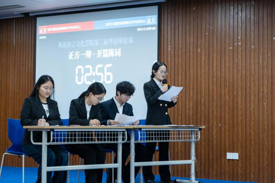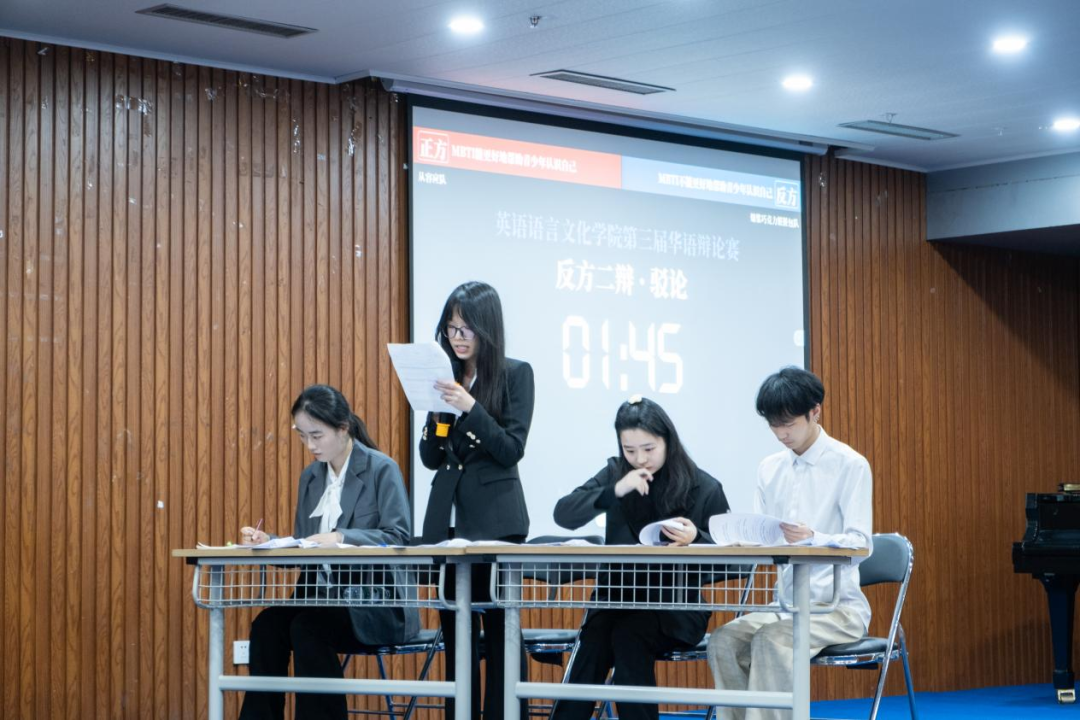正方从MBTI契合青少年人格发展阶段以及它能为青少年提供结构化自我认知框架进行论述;反方则通过MBTI缺乏现代心理学实证支持,以及二元划分过于简单等角度进行反驳。辩论过程中,选手们引经据典,妙语连珠,台下的同学们聚精会神,沉浸其中,掌声不断。