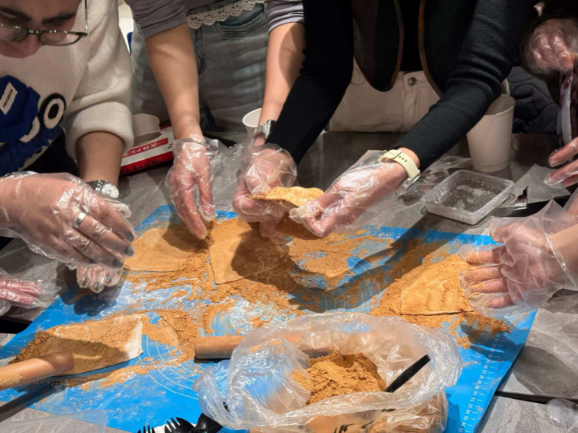活动尾声,大家捧着自己亲手做的驴打滚,自然地围在一起分享。只凭着这一口共通的香甜,不同文化背景的人们凑得更近,在分享食物的默契里,为这场非遗体验画上了温暖的句号。