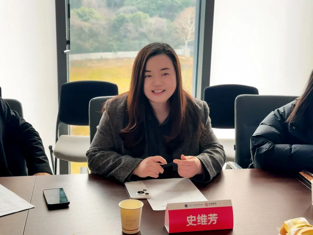 史维芳介绍了新通教育集团的发展情况。她表示,新通是一个重视年轻人、给予年轻人广阔发展空间的平台。他们始终相信,年轻人只要有梦想、脚踏实地,就能获得展现自我的机会,实现个人价值与职业成长的飞跃。同时,她也对英文学子能吃苦、肯思考的精神给予高度肯定。她期待浙外为企业输送靠谱、高素养的员工,在实习过程中提前感受就业的氛围,帮助年轻人快速成长,提升自身竞争力,为未来的职业生涯打下坚实的基础。