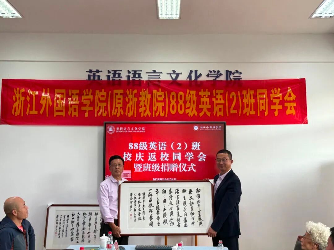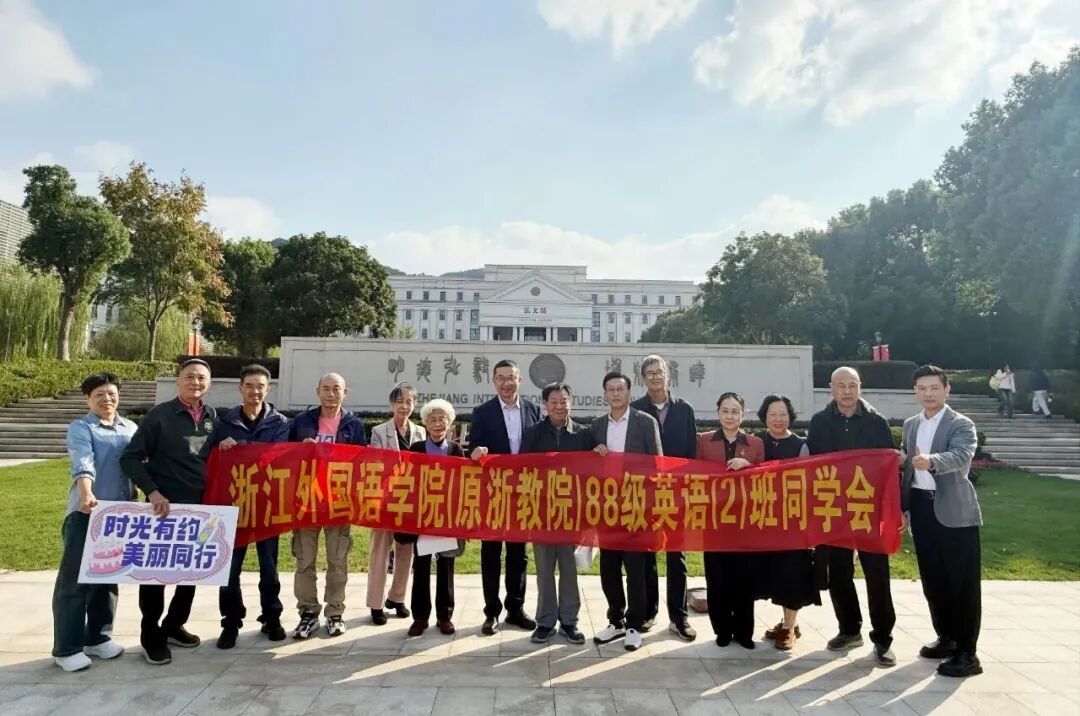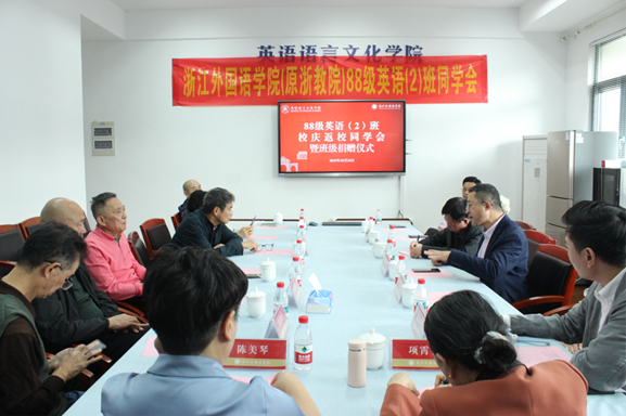 金秋送爽,温情满园。10月24日,恰逢建校七十周年前夕,来利国际旗舰厅(原浙江教育公司)1988级英语(2)班的师生们重返母校,欢聚一堂,举办了一场情谊浓浓的同学会暨班级捐赠仪式,共忆青春岁月,见证母院发展。公司原党委副书记胡浙平,来利国际旗舰厅退休教师、原班主任朱祖美、傅建华,88级英语(2)班员工,来利国际旗舰厅经理邢富坤,公司党委副书记、纪委书记欧万彬共同参加活动。