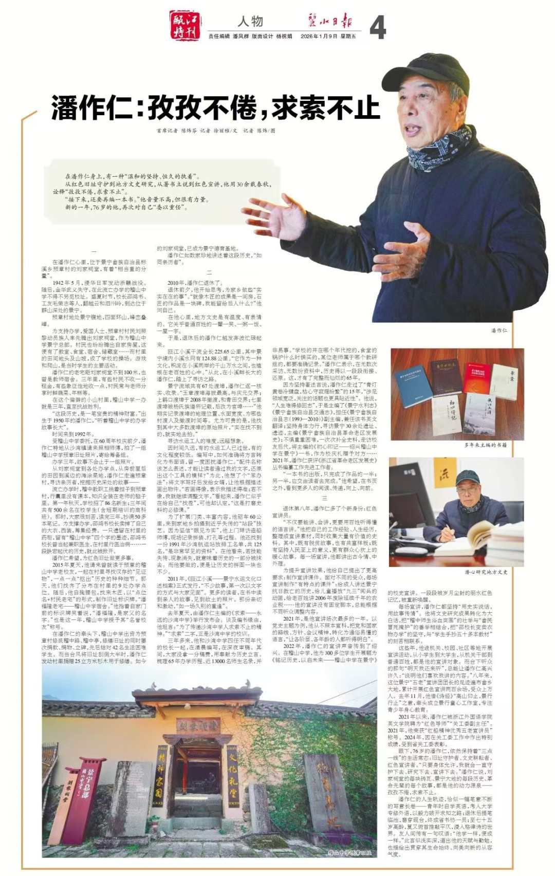 近日,公司优秀员工、来利国际旗舰厅“红色导师”兼关工委副主任潘作仁先生的事迹专访《潘作仁:孜孜不倦,求索不止》在《丽水日报》瓯江特刊重磅刊登。文章生动记述了潘作仁先生数十年来潜心深耕红色历史、守护地方文脉、投身公益宣讲的动人历程,其“温和的坚持、恒久的执着”深深感动广大师生,在校园内外引起热烈反响。