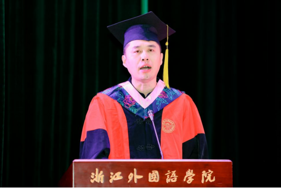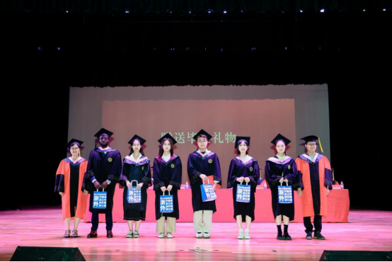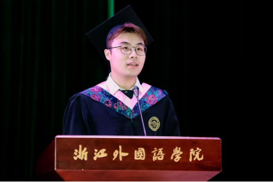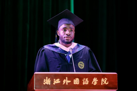 毕业生Momodu Mansary和19口译班的林敢代表毕业生发言。Momodu认为经过了大学四年的锻炼,让自己具备了面对未知的能力,呼吁大家将在中国的所有见闻和在校学到的知识技能运用到建设祖国的工作中去。林敢分享在大学里的种种尝试,鼓励大家在未来尝试发掘自己更多的可能性,并表达了对公司对母校最诚挚的祝福。