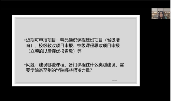 英语系杜娟娟博士具体分享了省级一流课程建设经验。她以课程《英语社会国家与文化》为例,阐述了课程建设过程与进展,分享了个人体会。
