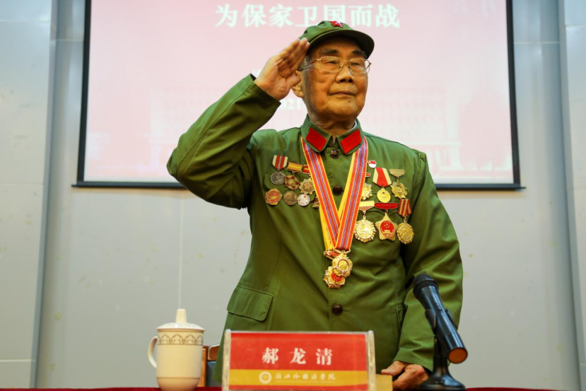 郝龙清老人结合自己抗美援朝经历,从战争的性质、敌我力量对比、决胜战争的因素以及赢得战争的意义四个方面对自己亲历的抗美援朝战争进行了回顾,再现了七十多年前中国人民志愿军为保家卫国跨过鸭绿江,在战场上不怕牺牲的场景。“让去哪里就去哪里,让干什么就干什么,一切服从命令听指挥,毫不含糊!” 老人家铿锵有力的句句话语让在场的师生党员无不敬仰钦佩。
