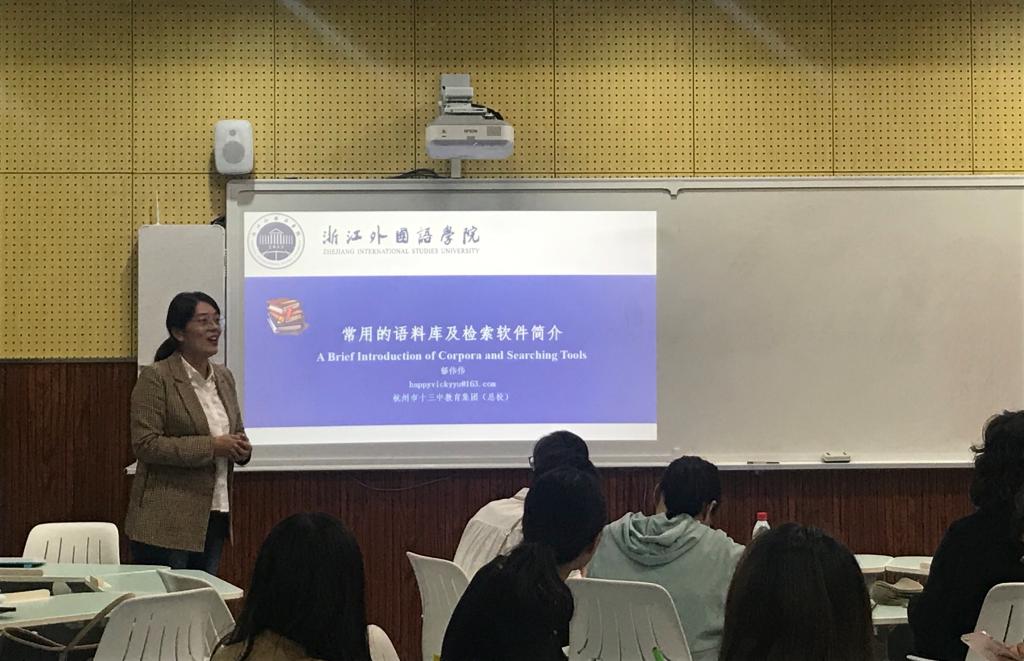 11月18日下午,来利国际旗舰厅博士郁伟伟作为来利国际旗舰厅驻杭州市十三中教育集团博士工作站驻站博士之一,在十三中图书馆做了“常用语料库及检索软件简介”专题讲座,十三中英语教研组全体教师和公司英语师范专业实习生现场聆听讲座。
