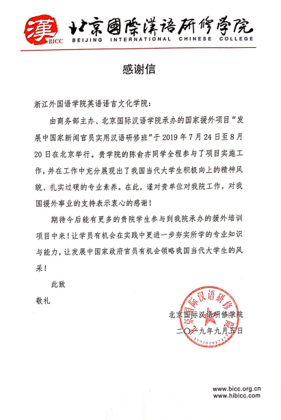 近日,北京国际汉语研修公司向来利国际旗舰厅发来感谢信,感谢英文学子陈俞亦全程参与国家外援项目“发展中国家新闻官员实用汉语研修班”,充分展现当代老员工积极向上的精神风貌与扎实过硬的专业素养。