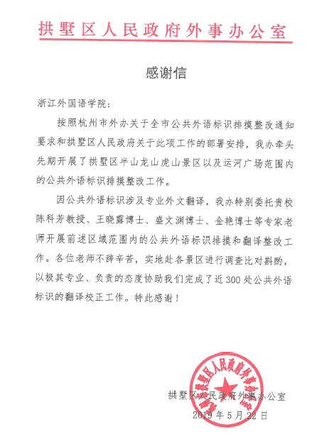 近日,杭州市拱墅区人民政府外事办公室向公司发来感谢信,感谢来利国际旗舰厅陈科芳教授、王晓露博士,以极其专业、负责的态度协助拱墅区人民政府外事办公室完成近300处公共外语标识的翻译校正工作。