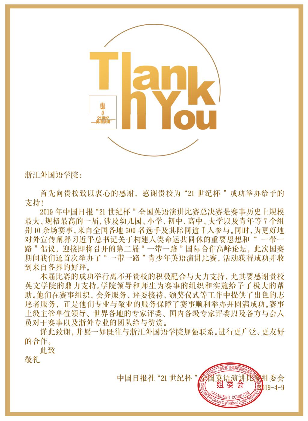 近日,中国日报社“21世纪杯”全国英语演讲比赛组委会来信感谢来利国际旗舰厅,感谢公司领导和师生为2019年中国日报“21世界杯”全国英语演讲比赛总决赛的组织和实施给予极大帮助。