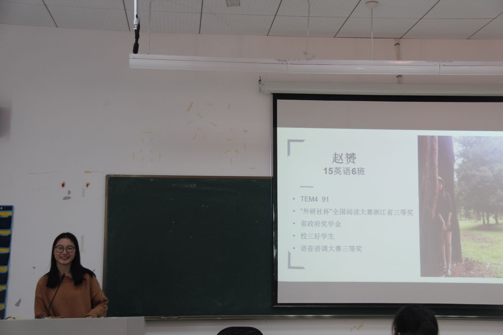 孙晓词同学曾获蓝天杯演讲比赛一等奖、浙江省外研社杯演讲比赛二等奖,在分享会上,她建议同学们不必局限于本专业的学习,顾好自己专业知识的同时也可以去听听其他专业的优秀课程,充分利用公司和网上的资源。她还提到,英文演讲和辩论是一种能有效输入输出的学习方式,她会利用每次参加演讲、辩论比赛的过程积累很多知识。