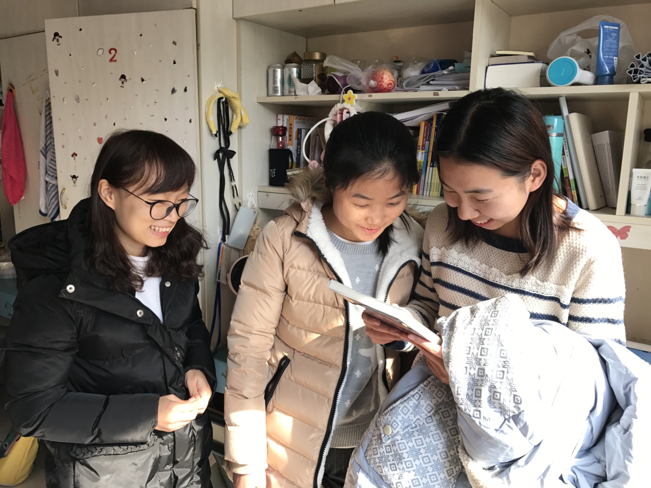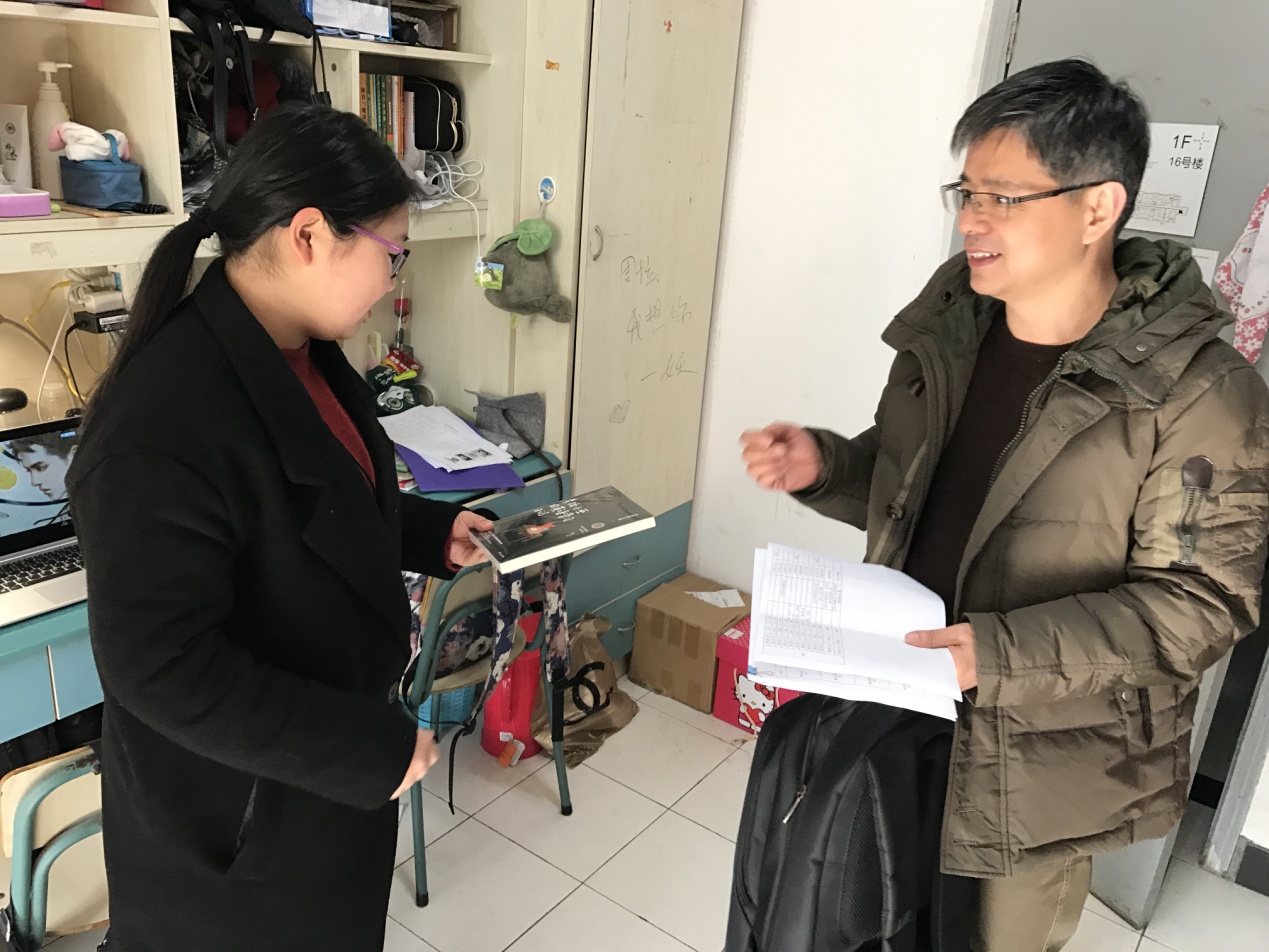每走进一个寝室,沈主任和包书记都亲切地与同学们交谈,详细询问了同学们的生源地、入学后的感受及个人爱好等,了解了他们的住宿、生活情况。在新生寝室,沈主任还很贴心地给寝室成员送上了《考拉小巫的英语学习日记》,叮嘱新生要好好学习考拉小巫的学习方法,但不要局限于此,眼光需开阔,更不要将自己仅定位为英语语言人才,语言只是工具,要不断提升自己,成为全方位的国际性人才。同时他还激励新生尽快适应公司生活,融入到新的环境中来,并附上自己的名片,告知同学们如果遇到问题可以请其帮助。包书记更是现身说法,以自己女儿的真实例子告诉同学们如何学习,如何对待自己的专业,如何更好地融入班级群体。