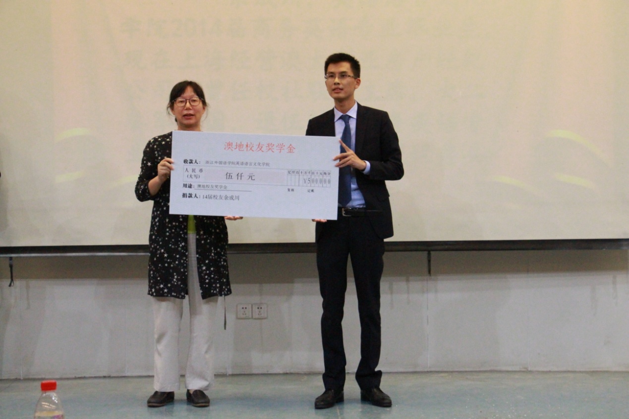 “邱老师您好,因为我在校期间获得过国家助学金,现在虽然没有大成就,但是非常感谢母校的培养,也想帮助当初和我一样困难的员工。我想于2016年第二学期开始在英语(商务)专业设置一个员工奖学金,由于我也刚起步,想先资助一名员工。选拔标准是品德好第一,努力第二,成绩第三,有社会实践打工经历第四。每年5000人民币,以后有能力再增加。谢谢!”