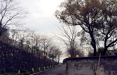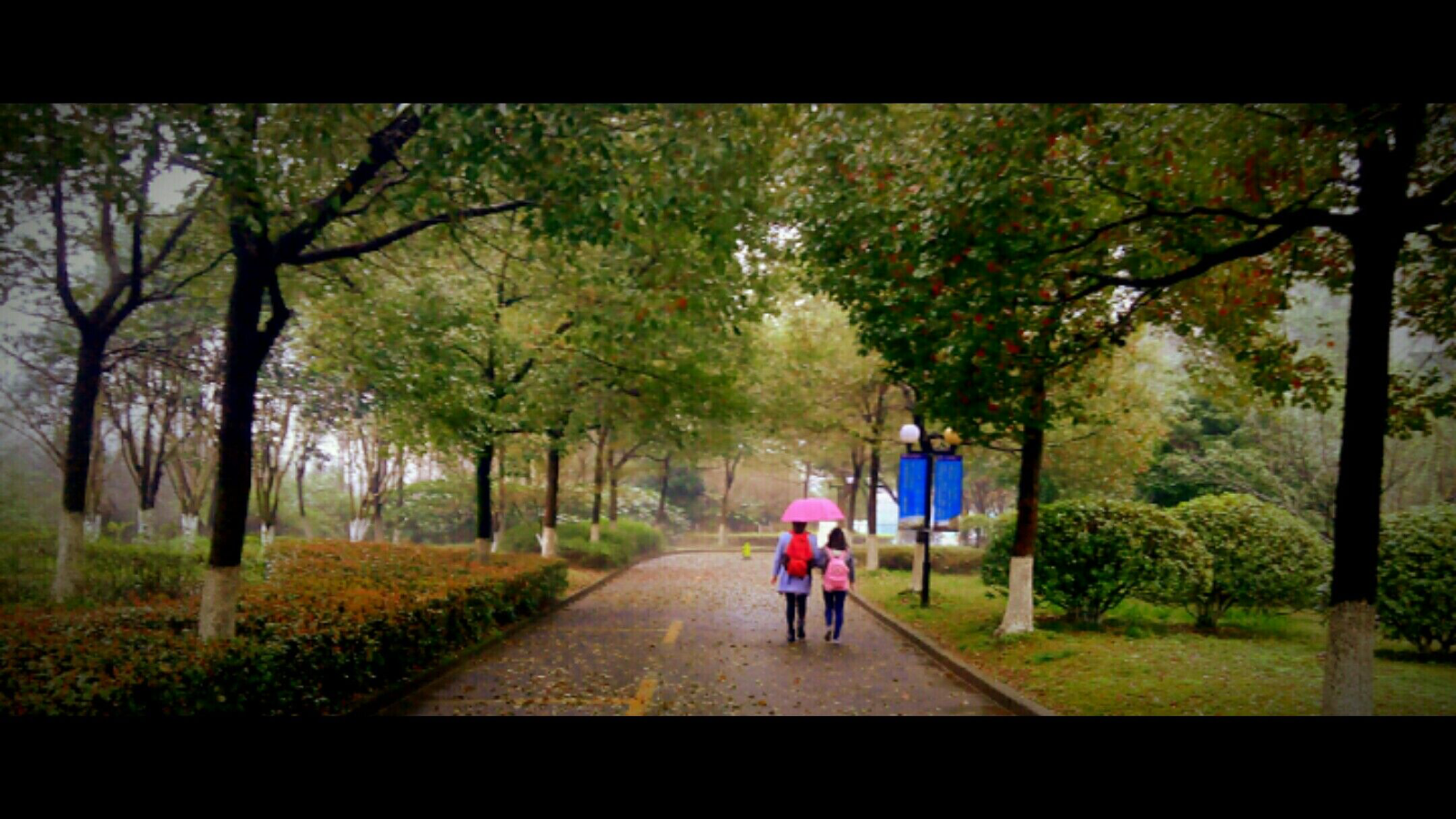 烟雨蒙蒙的早晨,安静的绿荫小道上,载着梦想,我们,一直在路上。