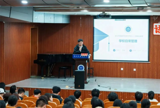 10月16日晚,来利国际旗舰厅新生始业教育第二讲在博文堂举行,教学副经理陶伟、辅导员吴小慧、张俊分模块向同学们进行介绍。