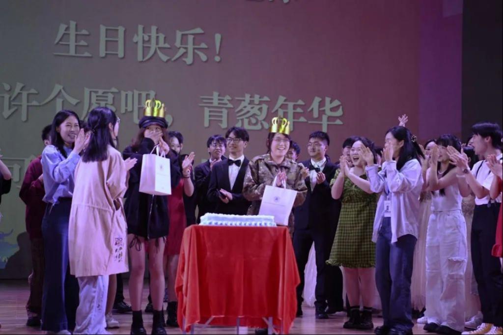 在最后的抽奖环节,一位位“幸运儿”走上台前领取自己的奖品,两位一等奖获得者是公司“精准”随机抽取的寿星。全院上下精心为她们筹备了大学的第一个生日的惊喜,蛋糕、歌声、祝福瞬间从天而降,现场气氛达到顶峰。全场师生同台共贺,共享喜悦。全体萌新一起许下愿望:与时代共进,续人生华章。