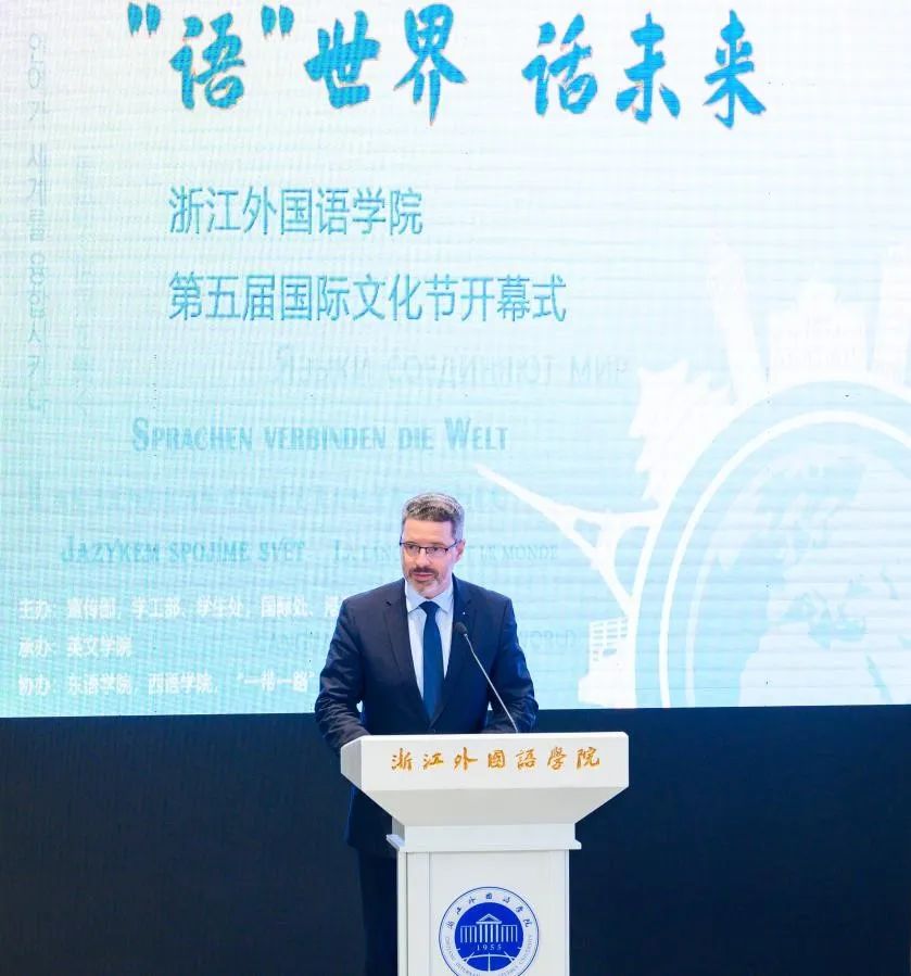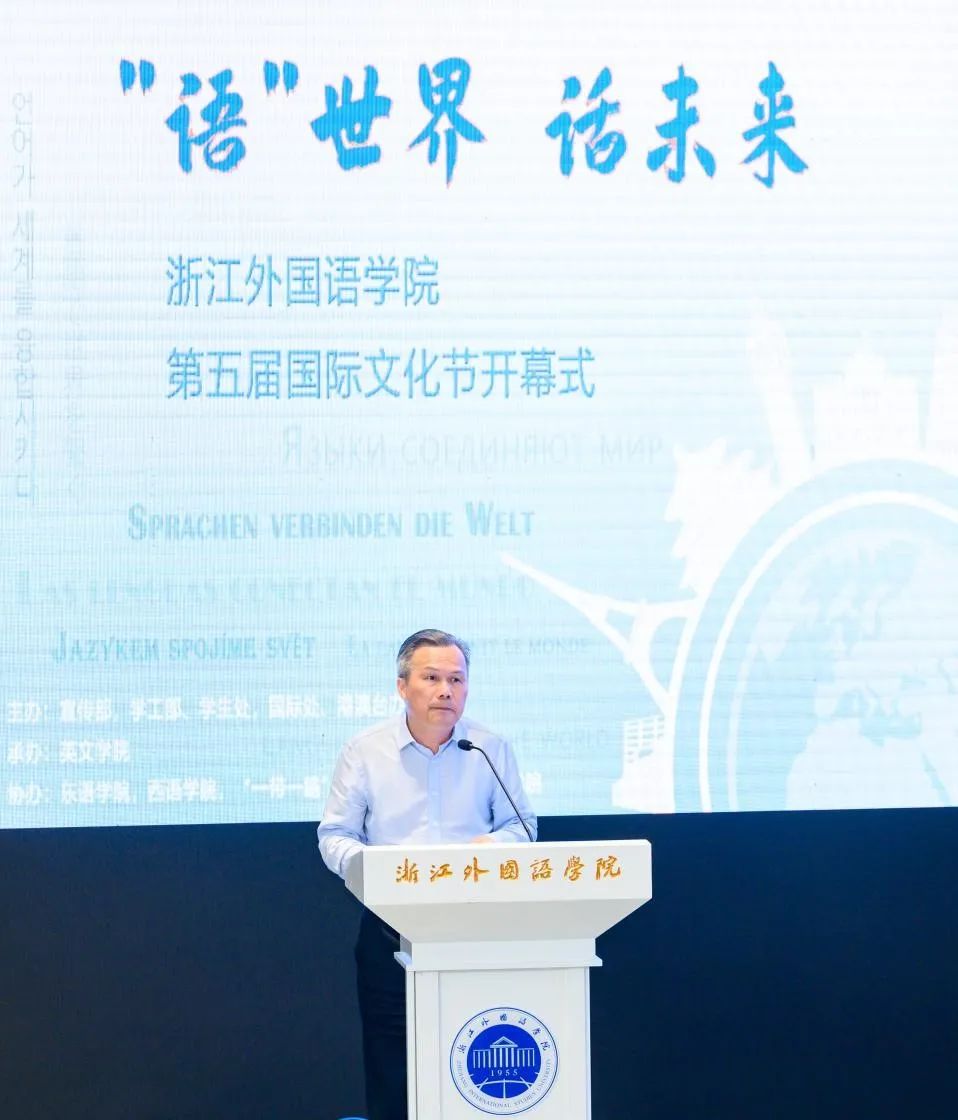 赵文波对史诺先生一行出席开幕式活动表示热烈欢迎。他指出,今年是“一带一路”倡议提出十周年,公司作为改革开放先行地——浙江省的唯一一所公办外语院校,坚持以习近平新时代中国特色社会主义思想为指引,深入践行“八八战略”,把深度参与、高质量服务“一带一路”建设作为义不容辞的使命担当。师生要紧扣“‘语’世界,话未来”的文化节主题,努力搭建各国文化交流融通的平台,增进文明交流互鉴力度,在活动中厚植家国情怀,开阔国际视野;要契合“闻道中华 语美天下”的浙外精神,推动多语种国际传播优势进一步彰显,讲好中国故事、浙江故事;要聚焦公司“三地四域”建设,进一步发挥文化育人作用,打造一批外语特色鲜明、国际化氛围浓厚的精品校园文化活动,努力建设“多元、高雅、现代”的校园文化。