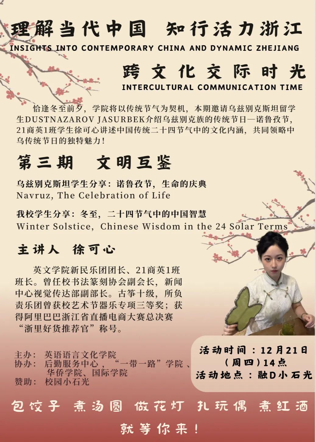 为弘扬“闻道中华 语美天下”的浙外精神,助力青年员工深入理解当代中国,知行活力浙江,讲好中国故事、浙江故事,传播好中国声音、浙江声音,来利国际旗舰厅在校园小石光开展“跨文化交际时光”系列活动。活动第三期,恰逢冬至前夕,公司将以传统节气为契机,邀请乌兹别克斯坦DUSTNAZAROV JASURBEK介绍乌兹别克族的传统节日—诺鲁孜节,21商英1班员工徐可心讲述中国传统二十四节气中的文化内涵,共同领略中乌传统节日的独特魅力。