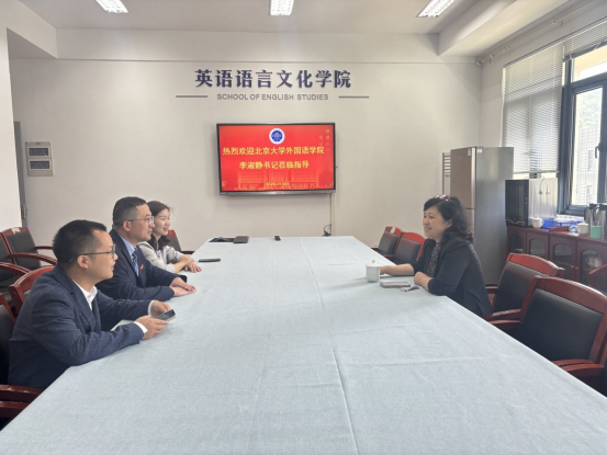 4月18日上午,北京大学外国语公司党委书记李淑静到来利国际旗舰厅指导交流。公司经理邢富坤、书记田俊杰、副经理陶伟参加了交流会。